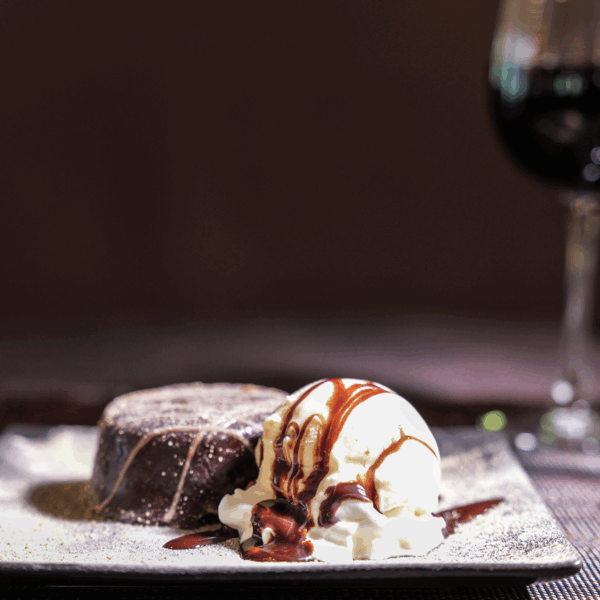 Hot Chocolate Cake with Liquid Fudge Center, Local Vermont Vanilla Ice Cream, Whipped Cream, Chocolate Sauce