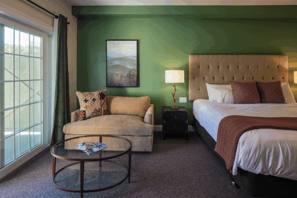Unwind in our Pond Ridge King, featuring a plush king bed, a private balcony overlooking the gardens and pond, and thoughtful amenities for a tranquil stay.